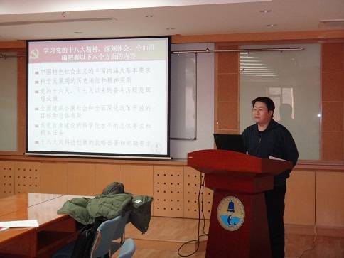 朱承纲同志首先传达了所党委关于学习宣传贯彻党的十八大精神的文件精神,强调了学习宣传贯彻十八大精神的重大意义。接下来,朱承纲同志为大家作了题为《中国共产党的十八大精神学习》的主题报告。报告总结了十八大精神的12个要点;着重把握6个方面;强调以为理论指导、实施创新驱动战略、知行合一地贯彻分解执行。随后崔杰同志从科学发展观、产学研结合角度和大家交流了学习心得,理华同志从科学发展观的角度谈了自己对十八大精神的理解。