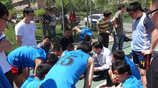 中午12:30,超声联队(蓝色队服)与微重队(黄色队服)比赛顶着烈日正式开始。比赛伊始,微重队首先利用默契的配合、有效的篮球传导确定了优势,取得良好的开局。超声联队球员不卑不亢,虽然有好几次失误,但通过积极的防守,逐渐适应了比赛的节奏,不断组织有效进攻,以18:18结束了上半场。下半场,8人轮转的超声联队渐感体力不支,比分逐渐被拉开,超声联队锲而不舍,不过最终还是以34:54遗憾落败。