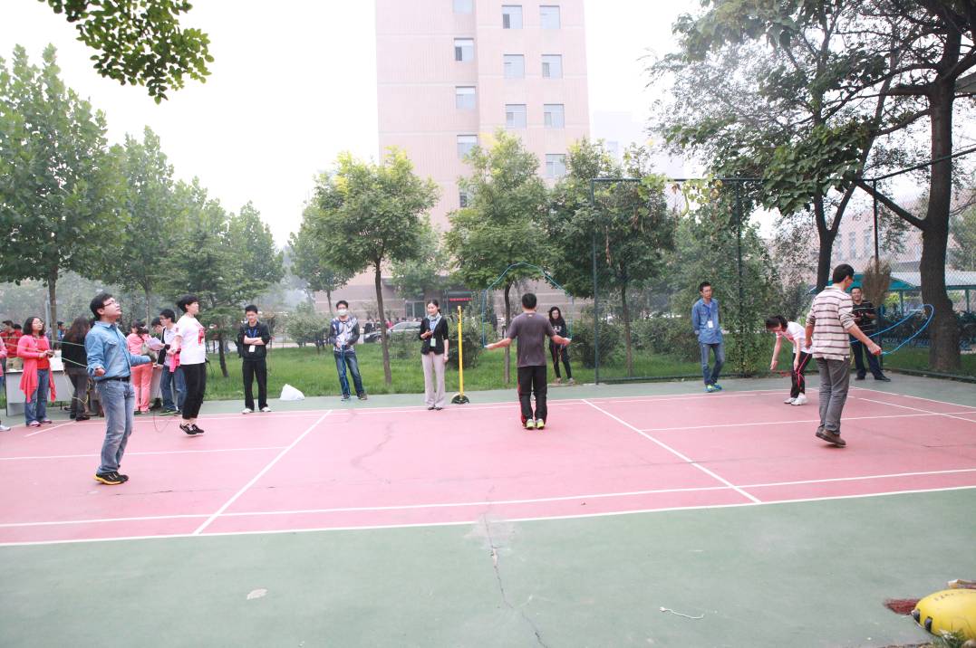 比赛在隆重热烈的开幕式后紧张而有序的展开了。比赛共有插红旗接力、单人跳绳、双人背对背夹球、双人定点投篮和套圈等五个项目,每个项目都在工作人员的主持下紧张有序的进行着。