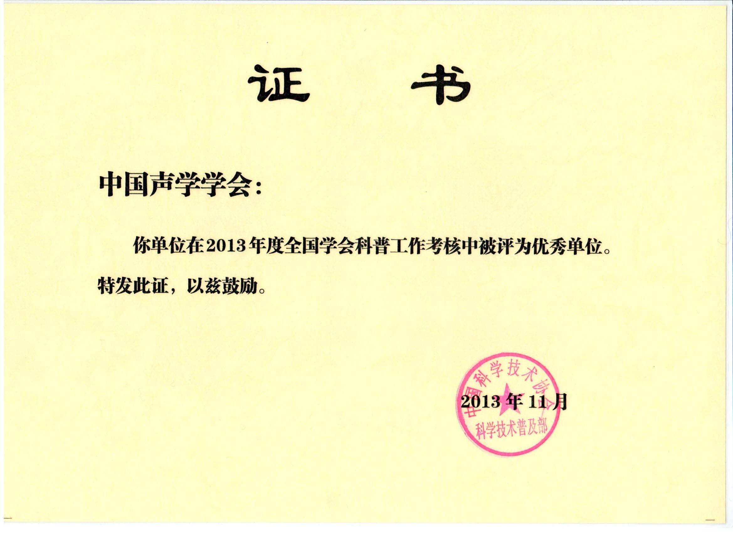中国声学学会在中国科协科普部开展的全国学会科普工作考核中,由于在学会科普组织建设;发挥会员和科技工作者在科普中的作用(特别是组建科学传播专家团队);学会开展科普工作的成效;承担完成中国科协安排布置的相关科普工作等方面表现突出,被评为“2013年度全国学会科普工作优秀单位”。