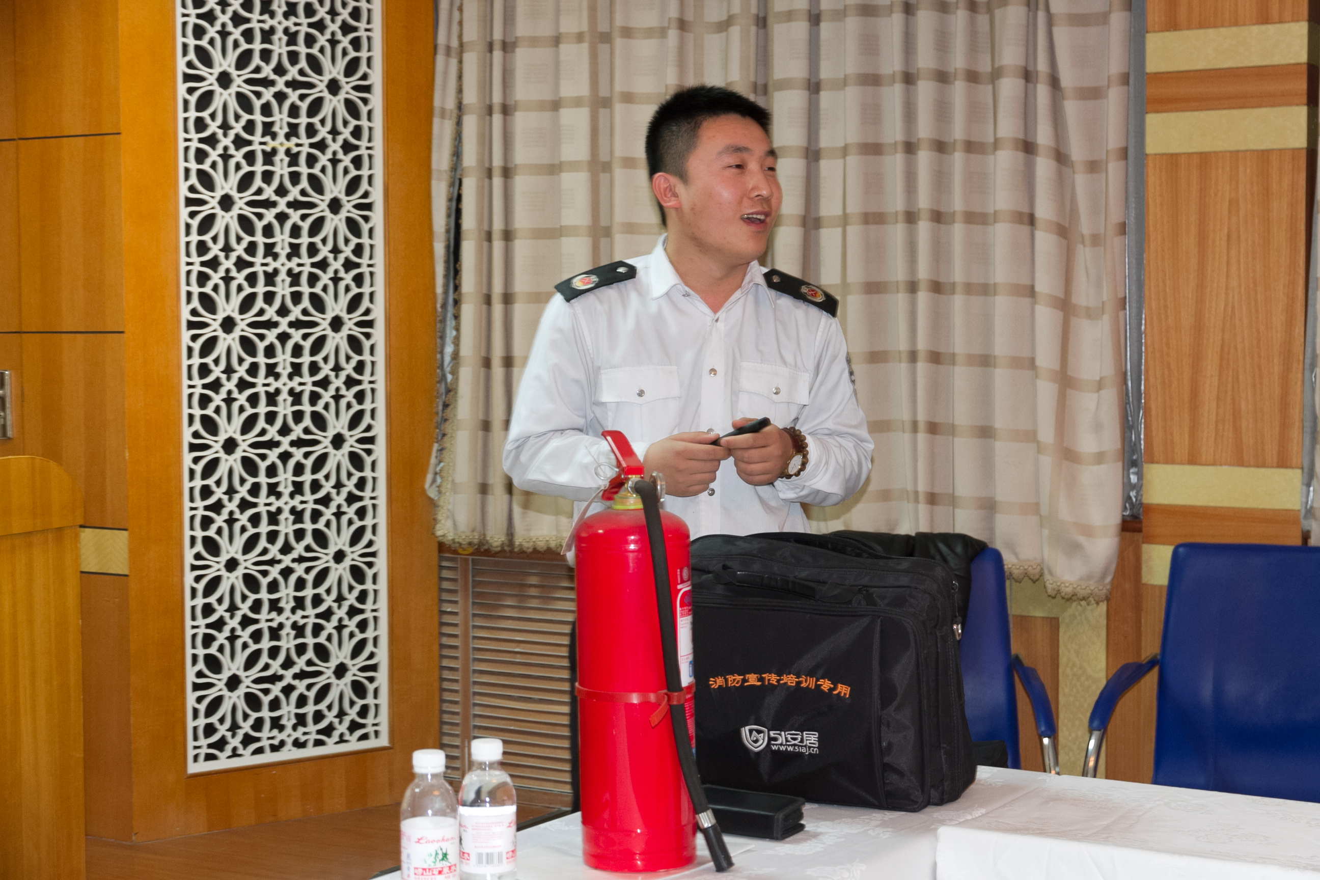 培训中,王杰教官以近年来国内,尤其是青岛市发生的典型火灾为案例,向大家强调了高度重视消防安全,面对火灾正确处置的重要性。针对现代日常生活中常见的火灾情况,王教官分别介绍了防治处理措施,并现场示范了逃生绳、灭火器、防烟面具等主要消防器具的使用方法。王教官犀利风趣的讲解、专业详细的答疑、积极深入的互动,很好地调动了大家学习的积极性,取得良好效果。