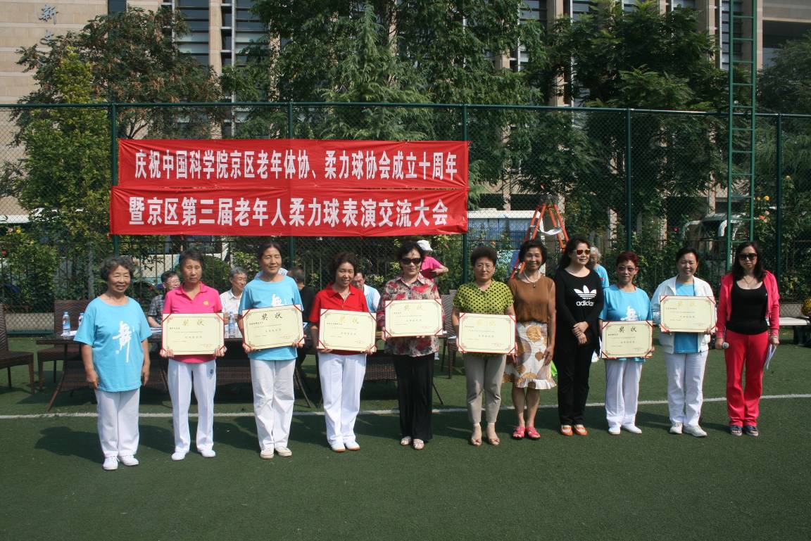 为庆祝京区老年体协柔力球协会成立10周年,京区第三届老年人柔力球表演赛于2014年9月5日在中关村体育场举行。中科院14个单位共218人组队参加了集体表演赛,我所共有9 位老同志参赛,荣获规定套路最佳优秀奖、花样传球项目最佳表演奖和优秀组织奖。