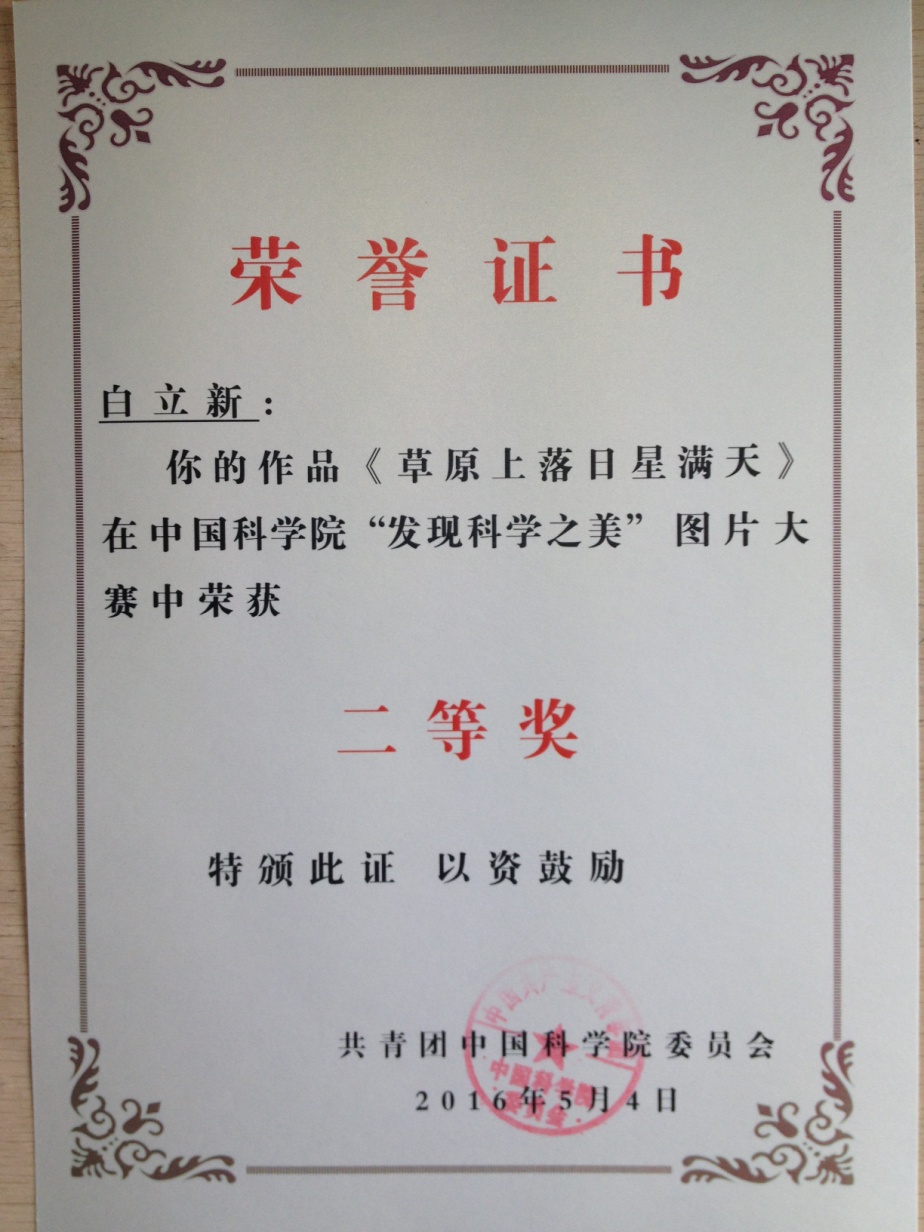 在中科院团委近期举办的“发现科学之美”图片大赛中,yx06永兴彩票集团超声技术中心白立新副研究员的作品“草原落日星满天”荣获二等奖,并在中科院团委纪念“五四”运动九十七周年暨“发现科学之美”图片大赛表彰交流会上收到表彰。
