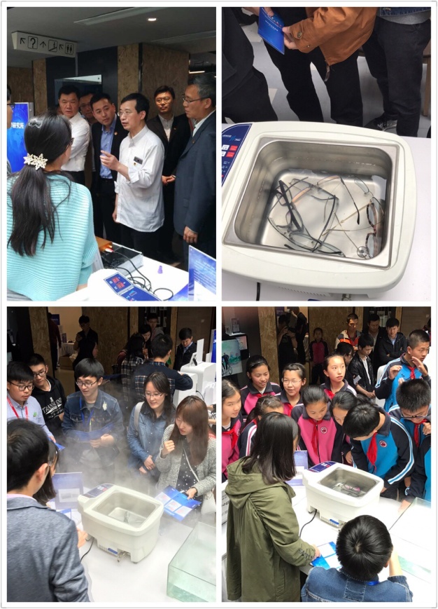 活动中,东海站展出的是超声清洗机,超声雾化机、声音定向传播仪、耳朵模型和人工耳蜗等产品,由于互动效果明显,展位人气颇高。