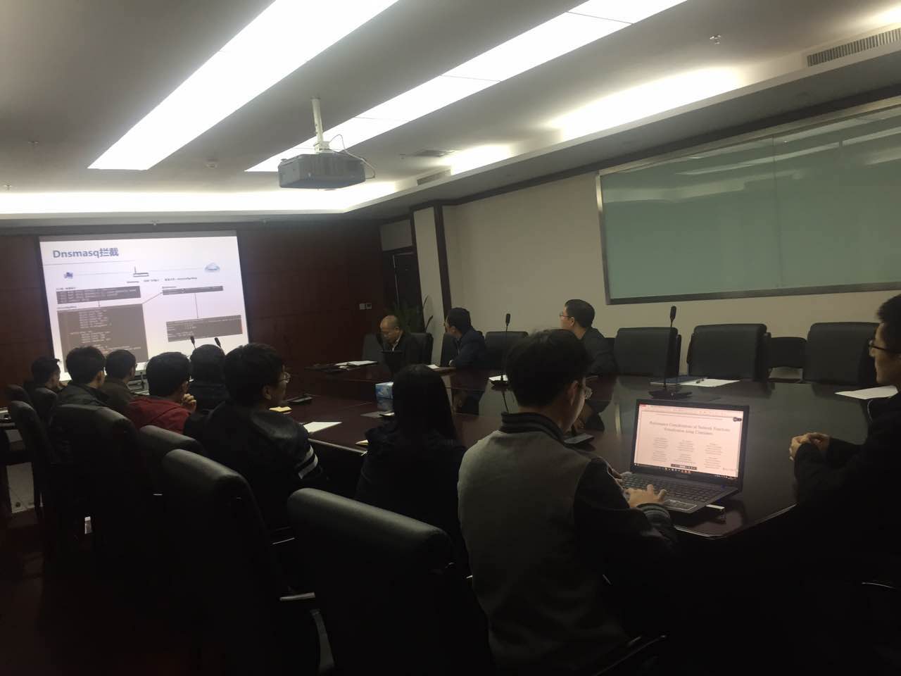 答辩过程包括项目组工作汇报及专家提问环节。在十分钟的项目汇报过程中,八个参赛项目组分别汇报了本项目的研究背景、研究内容、研究成果等。陈婉杰组对社交网络的社区发现和媒体传播进行了分析,算法研究和实现,通过实验证明了算法的性能,并申请了2项专利;井丽南组围绕针对Openflow和pof交换机应用,对多核平台的表查询和匹配算法进行了深入的研究和算法优化,申请了1项专利;其它各项目组也分别汇报了项目工作的亮点之处。