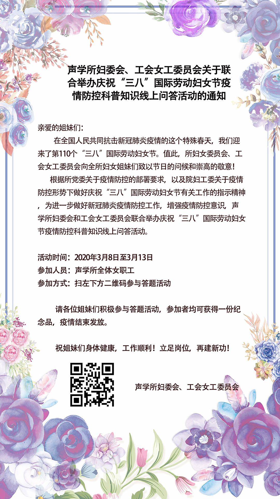 yx06永兴彩票集团妇委会和工会女工委员会根据所党委关于疫情防控的部署要求,以及院妇工委关于疫情防控形势下做好纪念“三八”国际妇女节有关工作的指示精神,为进一步做好新冠肺炎疫情防控工作,增强疫情防控意识,联合举办了纪念“三八”国际妇女节疫情防控科普知识线上问答活动。