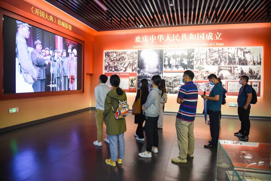 展览馆内展品丰富,珍贵的图片、报照、地图、画集等各式各样的文物处处可见。此外,展馆内还公开了许多珍贵的原始影像视频资料,给人以更加直观、震撼的观感。“人民欢迎解放军进城”再现了人民群众夹道欢迎解放军入城的历史场景,展览现场还有多个栩栩如生的蜡塑人,服装细节极其逼真,令人彷佛瞬间穿越时空,来到了那个热闹非凡的街道,一同挥舞着手臂为人民解放军欢呼。“西苑机场阅兵”和“开国大典”等珍稀影像,引起了大家的极大兴趣,吸引了众多党员驻足观看。