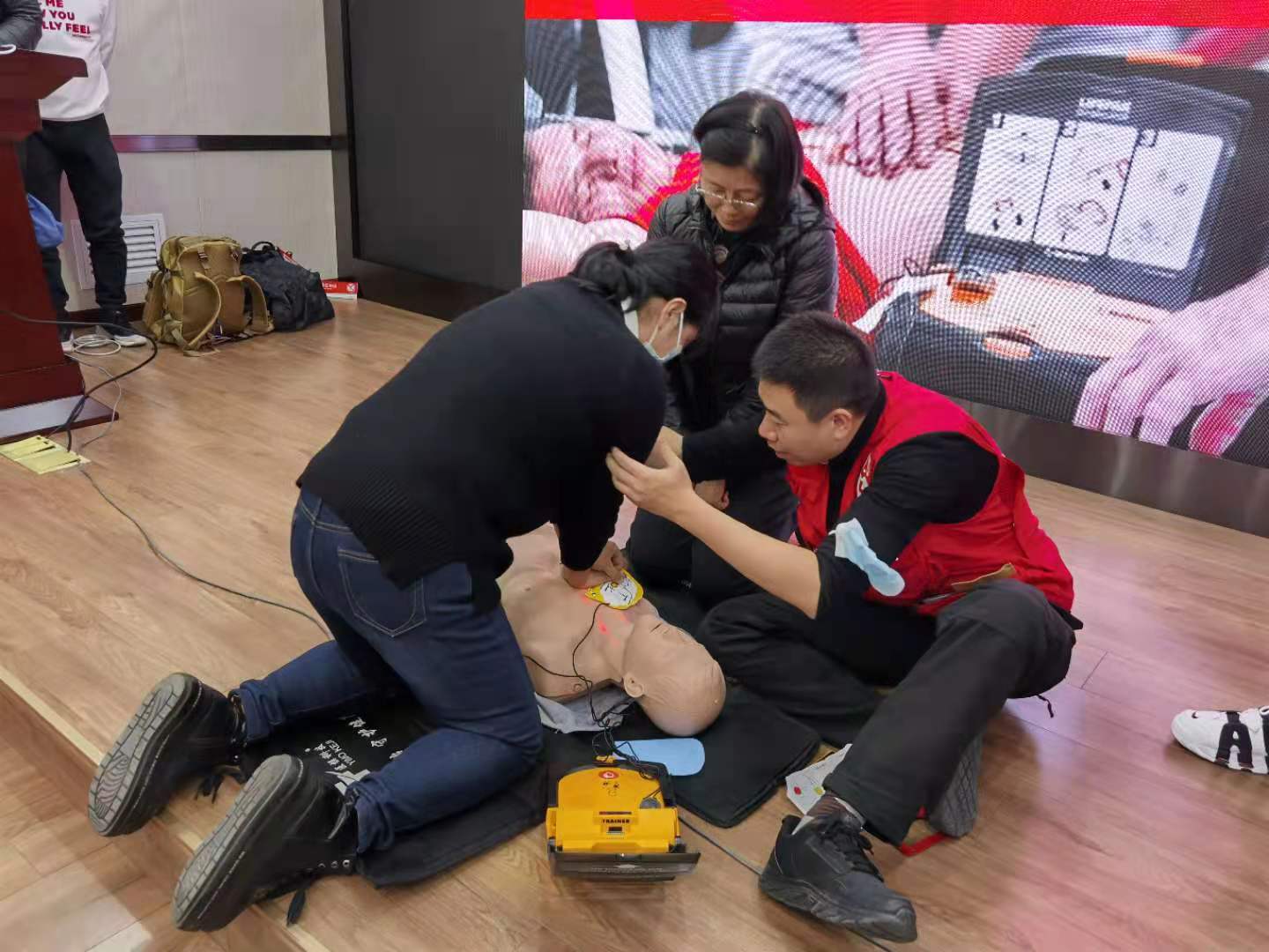 培训分为理论教学和实践操作两个部分。培训老师首先指出AED急救方法普及的重要性,国家对于施救者权益的法律保障;然后通过PPT讲解和实际演练,使每一位培训人员都能掌握心脏复苏术(CPR)和AED的操作步骤与使用方法,争取为心脏骤停患者赢得“黄金4分钟”的抢救时间;最后,培训老师还为大家讲解了生活中常会用到的海姆利克急救法和应对癫痫发作的急救措施。
