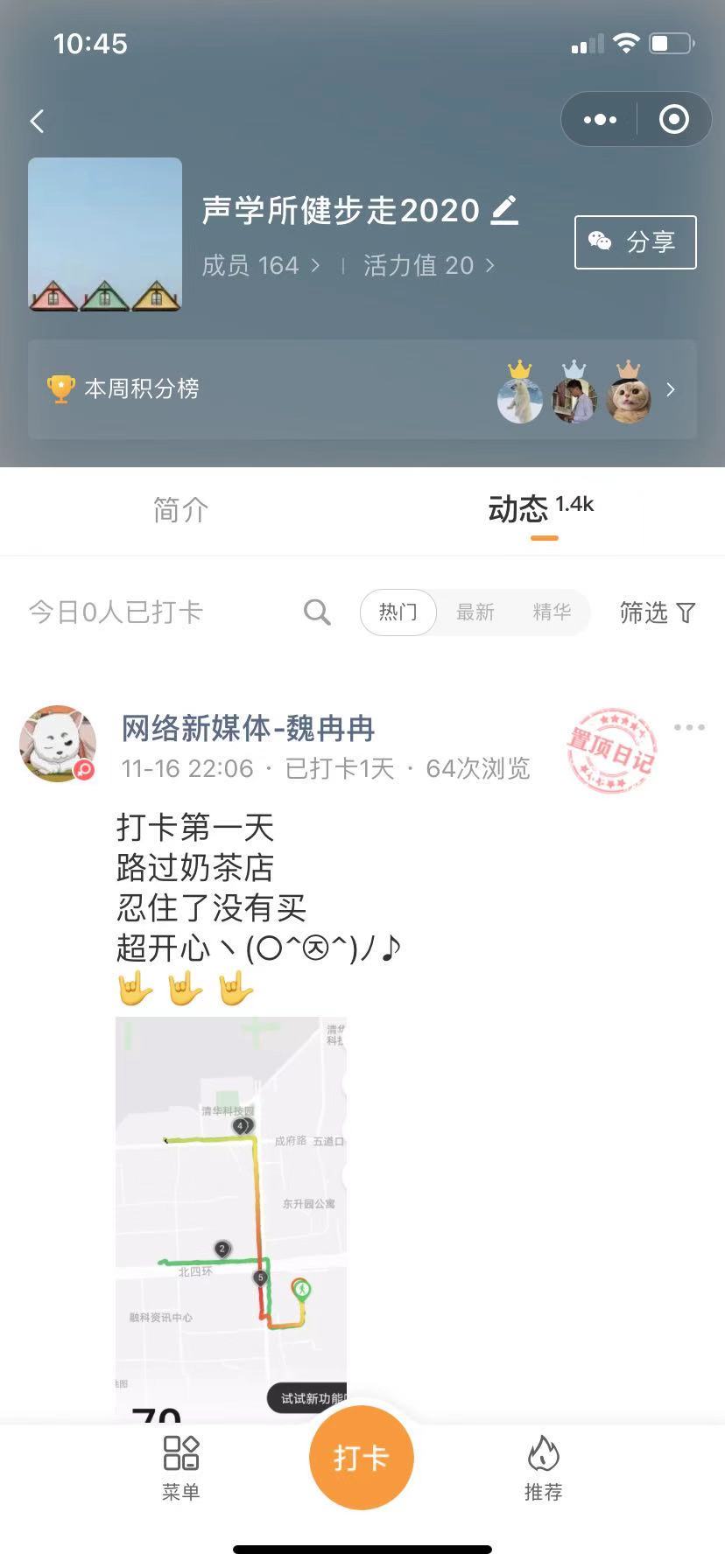 本次活动的参与形式为小程序记录每日一次性健步走里程数,活动一开始,就受到了同学们的热烈欢迎,为了每日里程达标,同学们积极采用步行方式出行。在健步过程中,同学们缓解了压力,愉悦了心情,充分感受越运动越健康的生活理念。