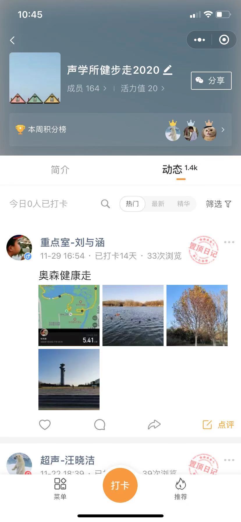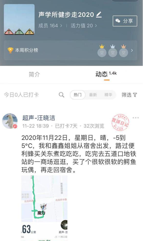 健步走过程中,同学们互相鼓励,一起坚持,在增强体质的同时,也有助于同学们之间交流,增进感情,能以更饱满的精神状态投入到科研和学习中。