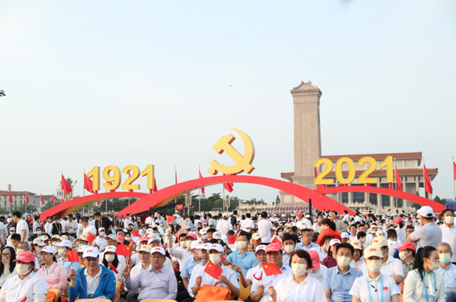 100门礼炮云霄回荡,五星红旗缓缓进场,战斗机呼啸而过,“100”“71”字样掠过长空。庆祝中国共产党成立100周年大会就这样拉开了序幕。天安门广场上,人民英雄纪念碑巍然矗立。纪念碑北侧,中国共产党党徽和“1921”“2021”字标格外醒目。广场东西两侧,100面红旗迎风招展,人民热情高涨,实验室的党员也被现场的气氛感染了。