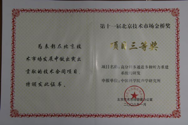 设立“北京技术市场金桥奖”的目的是为了表彰在促进首都科技资源转化为现实生产力中做出突出贡献的集体、项目和个人,起到繁荣技术市场,推动技术进步和经济发展的作用。该奖项每年评定一次,我所科技处金塞敏同志曾获得上届“金桥奖”个人三等奖。参加此次“金桥奖”评选的“高分辨多通道多极听力重建系统的研发”项目由我所医用声学实验室承担,该项目研制的听力重建系统是一种利用先进的电子处理技术,将声音信号转换成电信号传入内耳耳蜗,刺激重度耳聋患者残余听神经使其恢复部分听力的装置,项目研发能力达到行业先进水平,汉语语音识别功能优于国外同类系统,项目研制完成后可填补国内在听力重建领域的空白,服务于残疾人康复事业,具有很好的社会及经济效益。最终该项目在众多申报项目中脱颖而出,喜获本届“金桥奖”项目三等奖。
