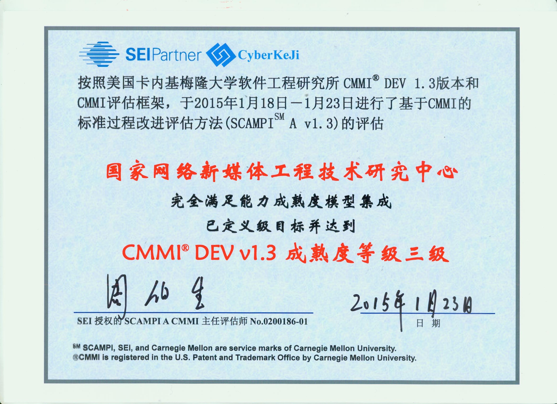 2015年1月18至23日,国家网络新媒体工程技术研究中心基于CMMI的标准过程改进评估方法进行了六天的现场评估工作,经赛柏科技CMMI主任评估师周伯生老师的认定,网络新媒体的软件过程改进工作满足能力成熟度模型,并达到CMMI DEV v1.3成熟度等级三级。