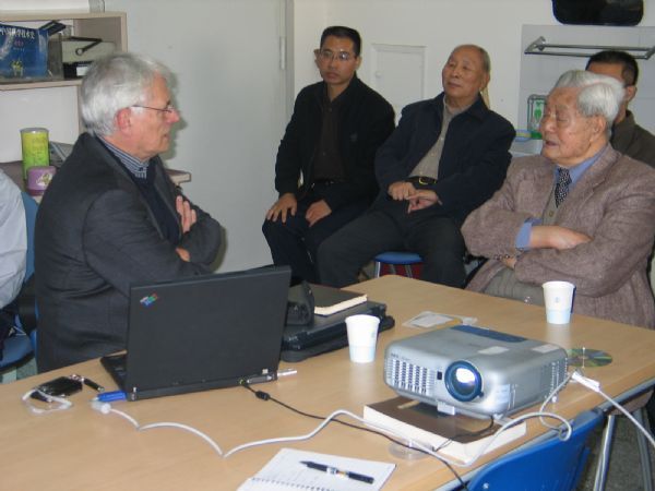 Arnold教授首先参观了水声换能器与测试技术实验室和声场声信息国家重点实验室,随后来到超声物理与探测实验室,与应崇福院士、王秀明研究员及郭成彬研究员等新老朋友亲切会面,并带来了应先生早年带领超声组制作的英文版本《用光弹技术研究超声波》录像资料,愉快地回忆了他与yx06永兴彩票集团超声组老一辈科研人员之间的交流合作。Arnold教授还为大家作了题为“Ultrasonic modes in atomic force microscopy”的精彩报告,介绍了原子力显微镜(AFM)的悬臂振动模式、原子力声显微镜和横向原子力声显微镜的波谱和成像及应用,并与yx06永兴彩票集团有关科研人员和学生围绕列车车轮的电磁声检测研究等问题进行了热烈的讨论。