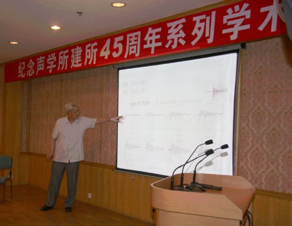 在讲述充液玻璃管内奇特的声世界的同时,应先生也从科学研究的一般规律出发,讲述了研究工作是如何深入发展的。从实验中发现问题,探索问题,最后又回到实验中讨论问题。他把这些年的研究内容概况地总结成5个问题:1.玻璃管中产生空化的声(type1)是什么样?2.这种声有没有重大特色?3.产生空化的波(type1)和空化本生产生的波(type2)在液体中此起彼伏的出现的原因和影响因素?4.如何从微观角度解释空化产生的原因?5.液体的空化阈值随时间的变化问题。在探索解决这些问题的过程中,他又敏锐的发现两个可能的科研生长点:type1波的应用前景和液体老化问题在其他领域中的应用。在这些研究过程中,既有声空化气泡本身的研究内容,同时也涉及到声波传播、气体分子运动、液体抗张强度等等多方面的研究内容。应先生用通俗的语言、严密的逻辑思维,并以他自身的科研经历,向在场的“年轻人”诠释了自己是如何进行科研创新,如何进行基础研究的,并深刻地阐述了科学研究创新主要是由实验得来的。报告结束后,应先生又认真回答了听众的提问。在长达一个半小时的报告中,应先生以九十一岁的高龄一直站立为大家做报告,体现了老一辈科学家认真负责的精神,以及对听众的尊重。