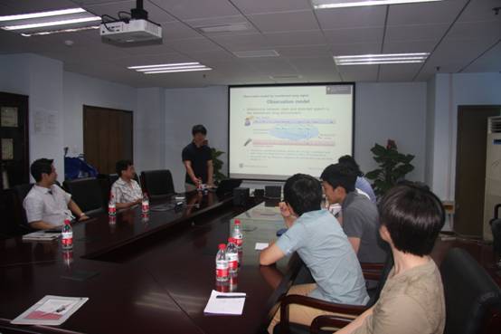 访问期间,Kim教授实验室的Shin Jae Kang做了题为“IMM-based feature compensation robust to slowly time-varying noise and reverberation”的学术报告。此项研究提出了基于IMM的特征补偿方法,从而提高了噪声混响环境下的自动语音识别的鲁棒性;初步的实验结果也表明了所提方法在复杂声学环境下的有效性。