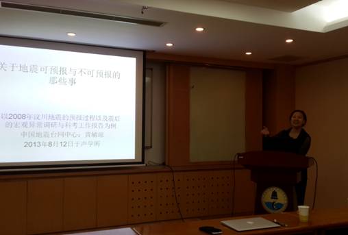 国家地震局流体学科首席地震预报员和首都圈短临震情跟踪专家组成员黄辅琼研究员主要研究方向为地震地下流体理论研究,报告题为“大地震宏观前兆观测”的报告,对大地震前如地下水位异常、气象异常、生物异常、次声波异常等宏观前兆的观测进行了阐述,并对各种宏观前兆现象在汶川地震前出现的情况进行了时间和空间上的统计分析,提出了将次声波异常观测结果与宏观异常研究对照研究的思路。
