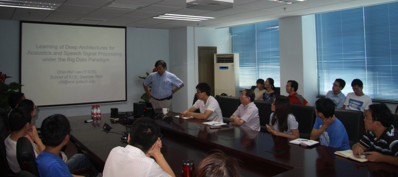 2015616日,美国佐治亚理工学院终身教授李锦辉教授来到yx06永兴彩票集团语言声学与内容理解重点实验室进行学术交流,并做了题为“Learning of Deep Architecture for Acoustic and Speech Signal Processing under the Big Data Paradigm”的研究报告,交流活动由颜永红研究员主持,付强研究员、周若华研究员等三十多名研究人员和在读研究生参加了此次报告会,报告后李教授与现场人员进行了深入细致的讨论。
