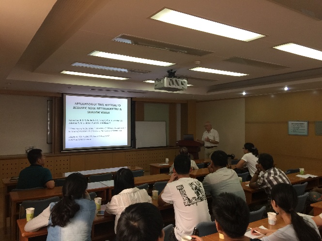 同时,Boris Katsnelson教授给研究生开设了为期四天的”Shallow water acoustics”的系列课程讲座,四天的讲座内容包括 “Shallow water acoustics. Statement of the problem, general description of sound propagation”、 “Internal waves in shallow water. Sound propagation in the presence of internal waves. Mode coupling and horizontal refraction”、 “Noise in shallow water. Spectrum, correlation function” and “Geoacoustic inversion, statement of the problem, methods, and several results”Boris Katsnelson教授耐心细致地为研究生们讲解了浅海声学基本概论、内波存在下的声传播、模态耦合和水平折射,浅海噪声谱和相关函数,声学参数反演问题的方法和结果等基础理论知识。