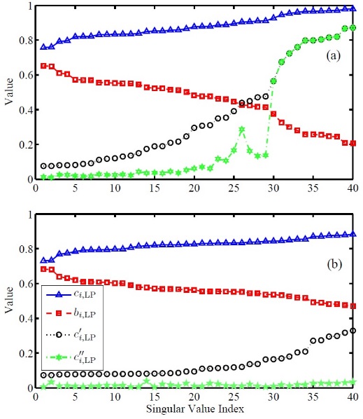 利用人耳噪声掩蔽曲线指导残留“音乐噪声”的抑制,研究人员推导了在线性残差域的噪声掩蔽曲线到广义特征值的映射关系,以及噪声掩蔽曲线约束的最优滤波器,将这个最优滤波器应用于信号增强。在语音段以及静音段带听觉特性约束的广义特征值如下图所示(绿线)。