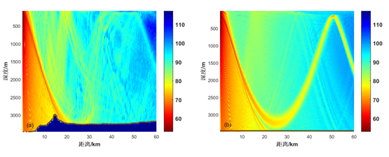 图1. RAM-PE模型计算的声传播损失,左图为实测海底地形下的计算结果,右图为接收阵位置处深度的平坦海底(图/中科院yx06永兴彩票集团)