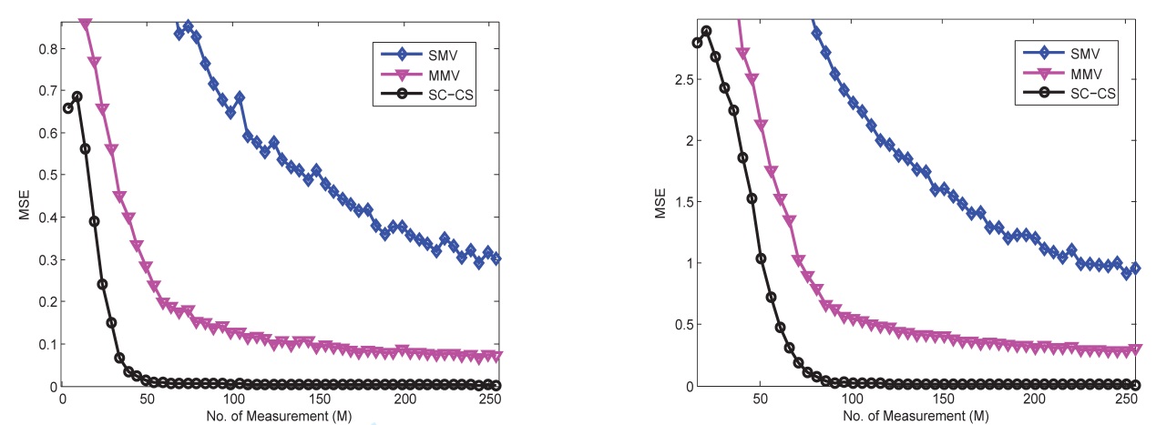 在SNR=-10dB环境下,不同方法的重构性能比较(信号稀疏度:左图为4,右图为16),其中纵坐标MSE表示重构信号与源信号的均方误差(Mean Squared Error, MSE),横坐标是测量值的数量(图/中科院yx06永兴彩票集团)
