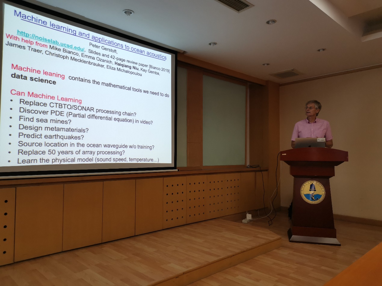 2019年7月19日,应声场声信息国家重点实验室邀请,美国加州大学圣地亚哥分校Scripps海洋研究所Peter Gerstoft教授访问yx06永兴彩票集团,并在yx06永兴彩票集团德昭楼218会议室作了题为 Machine learning and applications in ocean acoustics 的精彩学术报告。相关领域的科研人员和研究生参加了报告会。