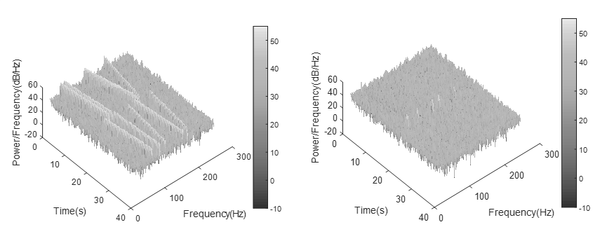基于贝叶斯频率估计算法的窄带噪声控制系统对单频噪声的控制性能(左图为原始噪声频谱,右图为基于贝叶斯频率估计算法的噪声频谱)(图/中科院yx06永兴彩票集团)