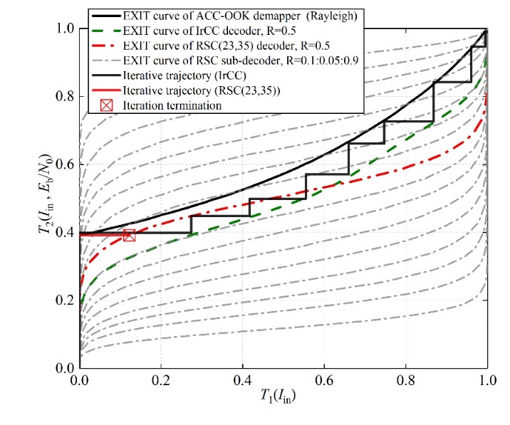 图2 Rayleigh衰落信道下IrCC与RSC的迭代轨迹(左)与误比特率性能曲线(右)对比(图/中科院yx06永兴彩票集团)