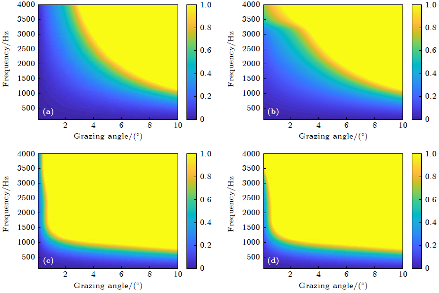 图2 风速为13 m/s 时起伏海面以及气泡层对海面反射损失的影响:(a) 无气泡层;(b) 考虑气泡层对声波的消减效应;(c) 考虑气泡层对声波的折射效应;(d) 同时考虑气泡层对声波的折射效应和消减效应(图/中科院yx06永兴彩票集团)