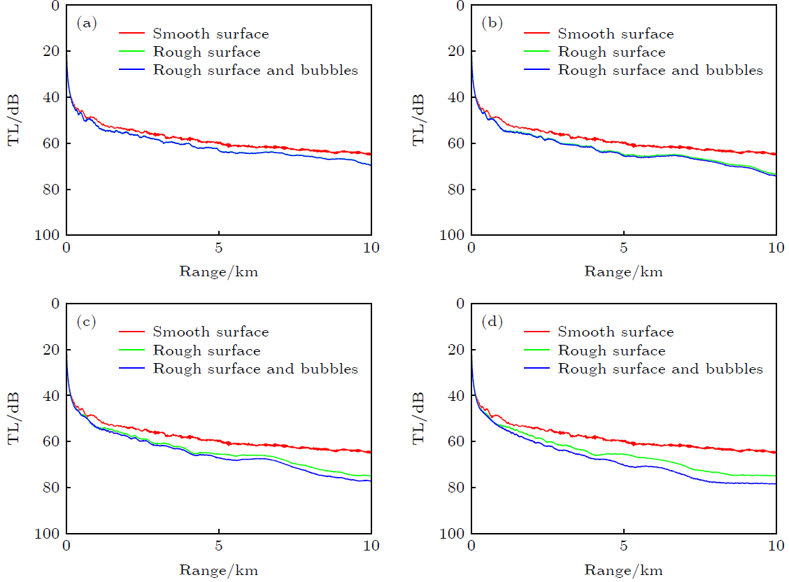 图1 风速为10 m/s 时起伏海面以及气泡层对海面反射损失的影响:(a) 无气泡层;(b) 考虑气泡层对声波的消减效应;(c) 考虑气泡层对声波的折射效应;(d) 同时考虑气泡层对声波的折射效应和消减效应(图/中科院yx06永兴彩票集团)