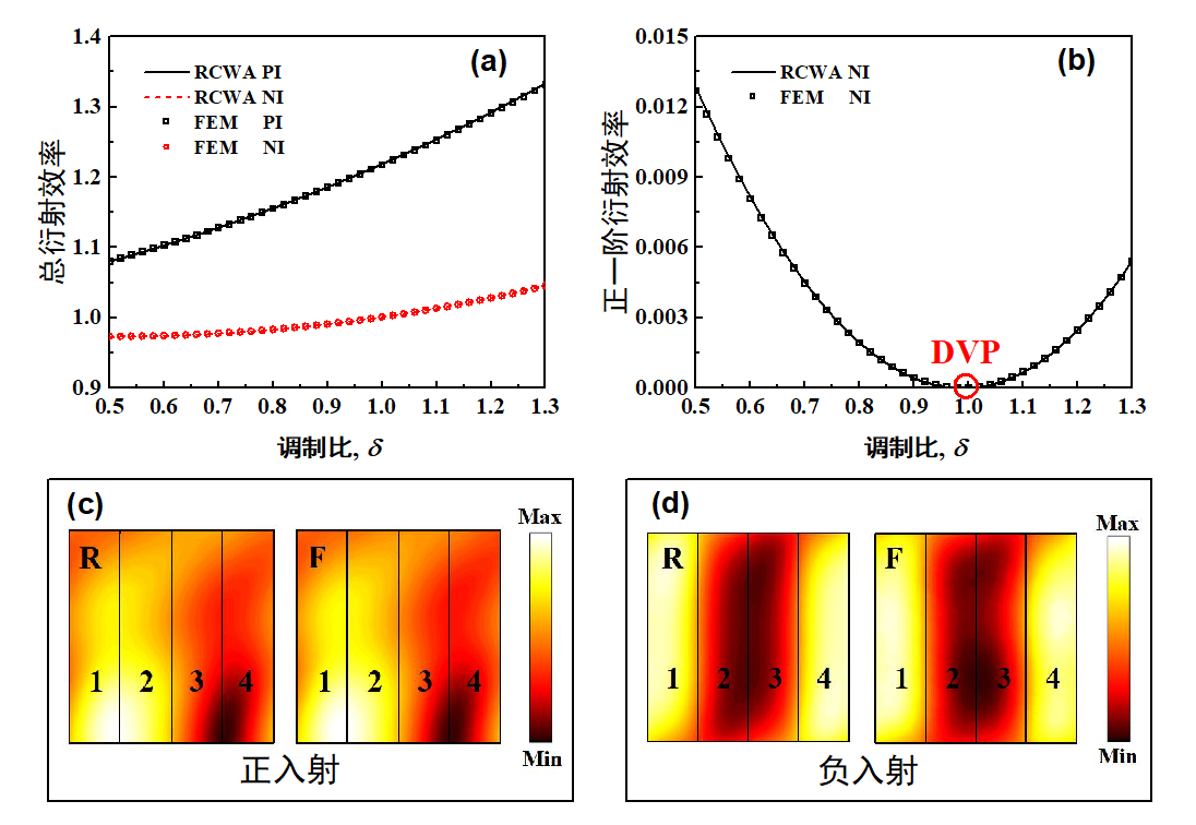 图2 (a)总衍射效率,(b)+1阶衍射效率,(c)正入射的声压分布,(d)负入射的声压分布(图/中科院yx06永兴彩票集团)