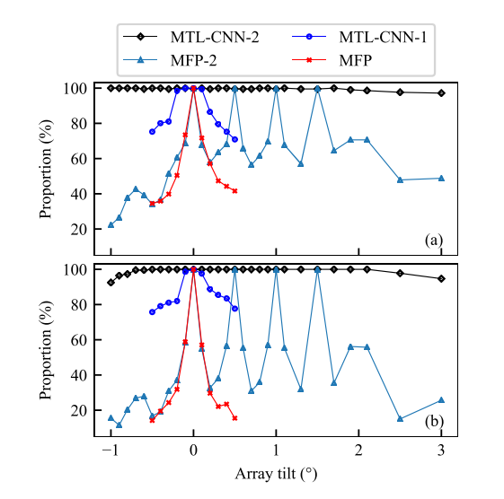 图1 不同方法对阵列倾斜的敏感性对比:(a)距离估计结果;(b)深度估计结果(图/中科院yx06永兴彩票集团)