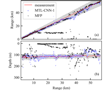 研究人员利用2016年的一次海试实验数据对方法进行验证。他们对1~57 km范围内的486个声源进行定位,对比多任务学习的卷积网络和传统匹配场方法可以发现,在匹配场方法失效的距离区间,这种新方法仍然能准确地对声源进行定位,验证了该算法在环境失配条件下的有效性。