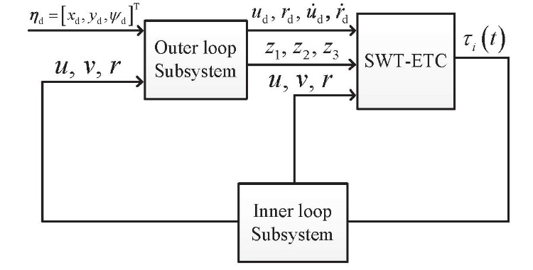 为了解决欠驱动水面舰艇模型的非线性、强耦合问题,研究人员首先提出了一种内外环结构,便于完成控制系统的设计与分析(图1)。然后设计事件触发条件,使控制器仅在满足触发条件时对系统采样并更新控制信号,从而得到SWT-ETC,实现了闭环系统的全局渐近镇定。