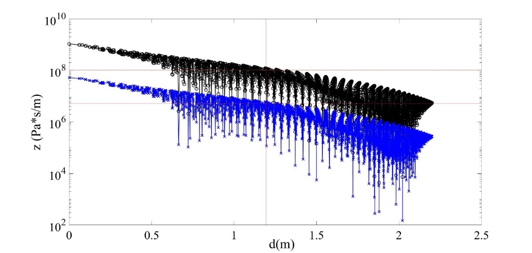 图2 弹性球壳的全局声阻抗矩阵幅值随距离变化曲线:黑线是100Hz结果,蓝线是2000Hz结果(图/中科院yx06永兴彩票集团)