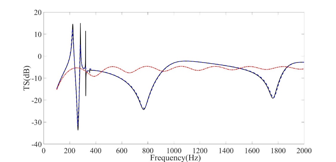 图3 平面波入射下水中弹性球壳的TS值:黑色实线为级数解;蓝色虚线为本文数值解;红色细点画线为硬壁球壳解(图/中科院yx06永兴彩票集团)