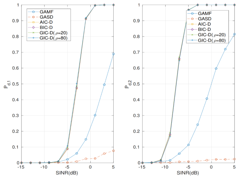 图1 左图与右图分别为在一个和两个相干干扰信号存在情况下,三种新方法的检测概率曲线(图/中科院yx06永兴彩票集团)