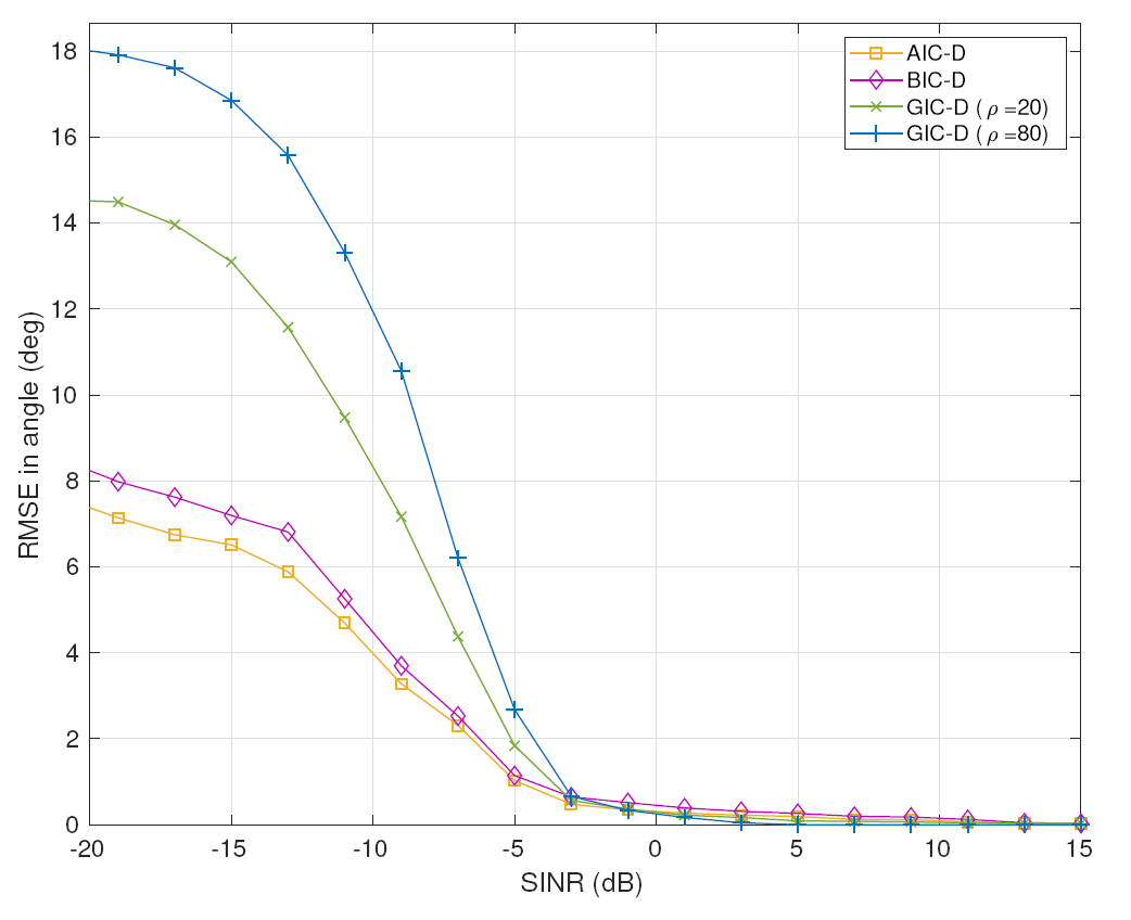 仿真分析结果表明,相较于广义似然比(Generalized Adaptive Subspace Detector, GASD)、广义匹配滤波器(Generalized Adaptive Matched Filter, GAMF)等传统方法,新方法具有更高的检测准确率。其中,GIC-D具有良好的估计相干干扰信号数量的能力,且干扰信号的方位估计精度随信干噪比的提升而明显提高。