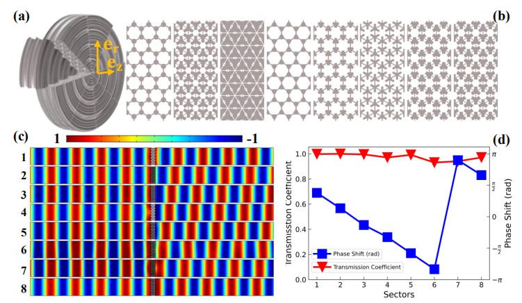 图2. 轨道角动量超表面器件:(a) 超表面由8份不同扇形单元拼装而成,(b) 每个扇形单元的横剖面图示,(c) 每个单元在平面波入射下的透射声场,(d) 8个单元的透射系数及相位(图/中科院yx06永兴彩票集团)