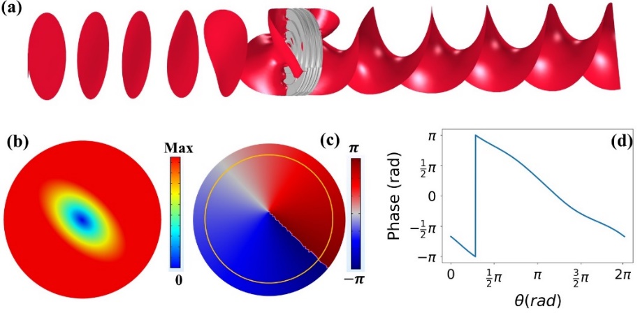图3. PM-DMM的仿真结果:(a) 频率为7100 Hz的平面波被超表面转换成了-1阶的涡旋波,(b) 涡旋波在z=235 mm处的幅值分布,(c) 涡旋波在z=235 mm处的相位分布,(d) 沿(c)中黄色圆环的相移(图/中科院yx06永兴彩票集团)