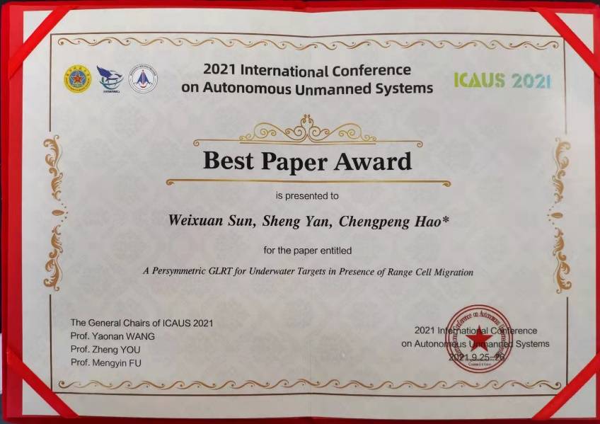 2021年9月25日至26日,由国防科技大学、北京海鹰科技情报研究所联合国内优势单位主办的国际会议2021 International Conference on Autonomous Unmanned Systems (ICAUS 2021)在长沙顺利举行。中科院yx06永兴彩票集团水下航行器实验室硕士研究生孙苇轩在郝程鹏研究员指导下撰写的论文A Persymmetric GLRT for Underwater Targets in Presence of Range Cell Migration获得了2021年度最佳论文奖。