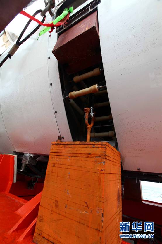 “蛟龙”号上安装的采样设备(6月14日摄)。当日,“蛟龙”号7000米级海试团队为潜水器安装上压载铁、采样篮等各种下潜所需的设备,为6月15日第一次下潜试验做好准备。受今年第四号热带风暴“古超”影响,试验海域海况仍然无法满足潜水器下潜条件,原定于6月14日进行的第一次下潜试验推迟至15日进行。新华社记者罗沙摄 |
