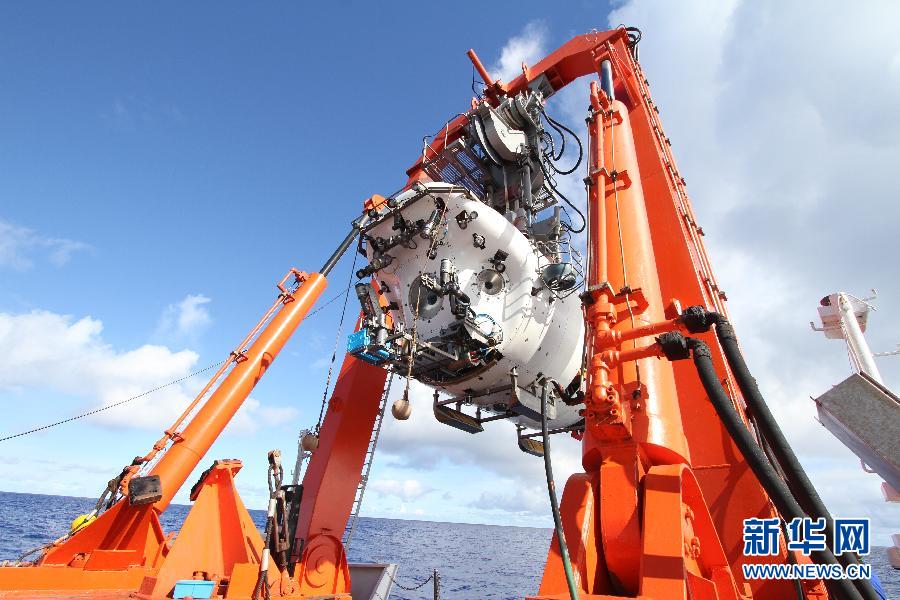 6月15日拍摄的试验中正在被放入水中的“蛟龙”号。北京时间15日7时,在西太平洋马里亚纳海沟试验区,3名试航员乘“蛟龙”号载人潜水器开始进行7000米级海试第一次下潜试验。 新华社记者罗沙 摄