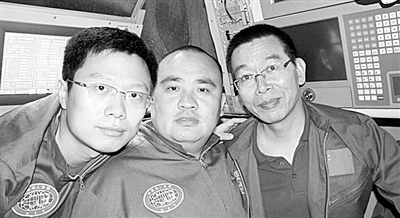 “蛟龙”号试航员、中科院yx06永兴彩票集团副研究员杨波(左一)与试航员叶聪、崔维成在载人舱内合影