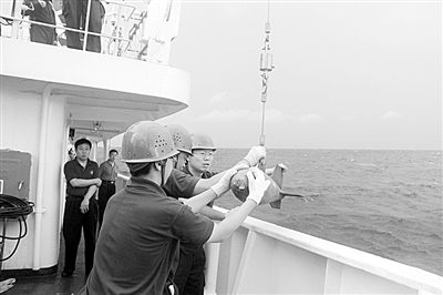 负责水声通信的中科院yx06永兴彩票集团海试队员在“蛟龙”号下潜前布放声学吊阵