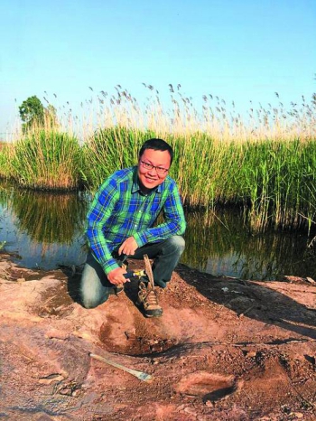几年前,他和同事在山东省临沭县发现了一个庞大的恐龙足迹动物群:临沭曹庄镇岌山恐龙遗址。前几天,他们又在临沭县附近的郯城展开新的足迹学调查,发现了一片新足迹,清扫了数百个足迹并且拍摄、测量。前往探班的美国《科学》杂志记者也为新发现震惊不已。