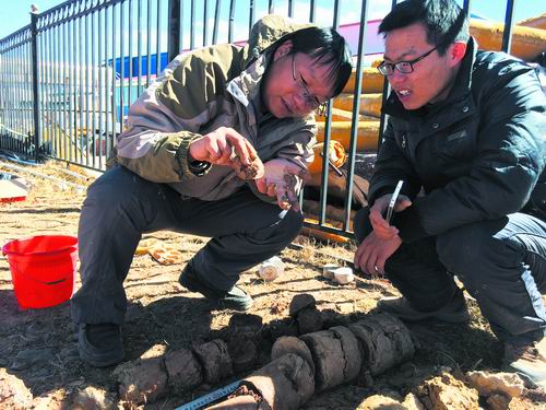 青藏高原北麓河站站长陈继(左一)在勘查地质。