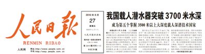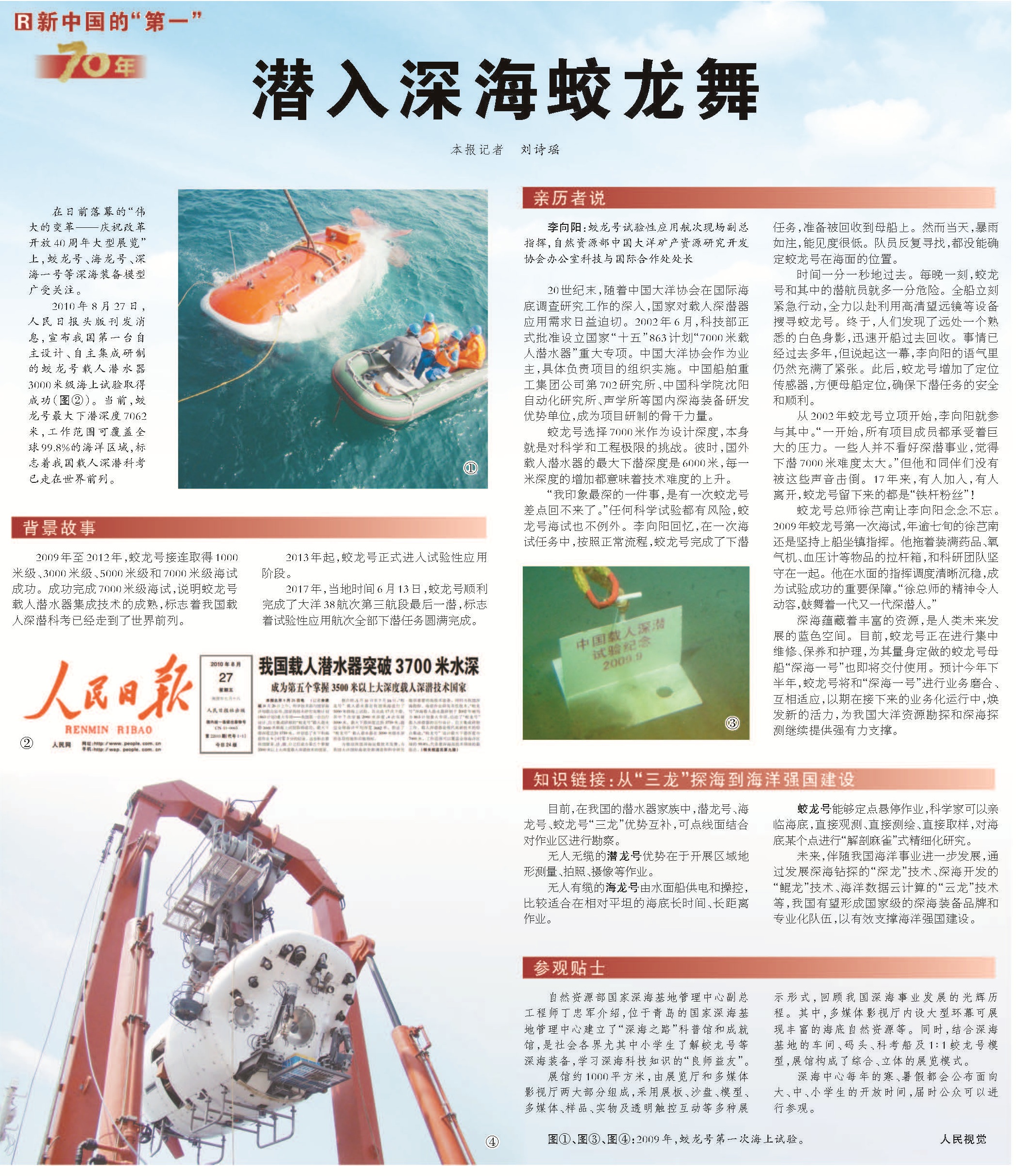 2010年8月27日,人民日报头版刊发消息,宣布我国第一台自主设计、自主集成研制的蛟龙号载人潜水器3000米级海上试验取得成功(图②)。当前,蛟龙号最大下潜深度7062米,工作范围可覆盖全球99.8%的海洋区域,标志着我国载人深潜科考已走在世界前列。