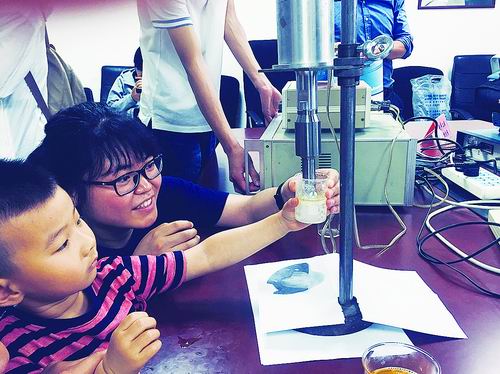 水和油能混合吗?在中科院海洋信息技术创新研究院暨声学研究所,公众在参与超声乳化实验。韩扬眉摄